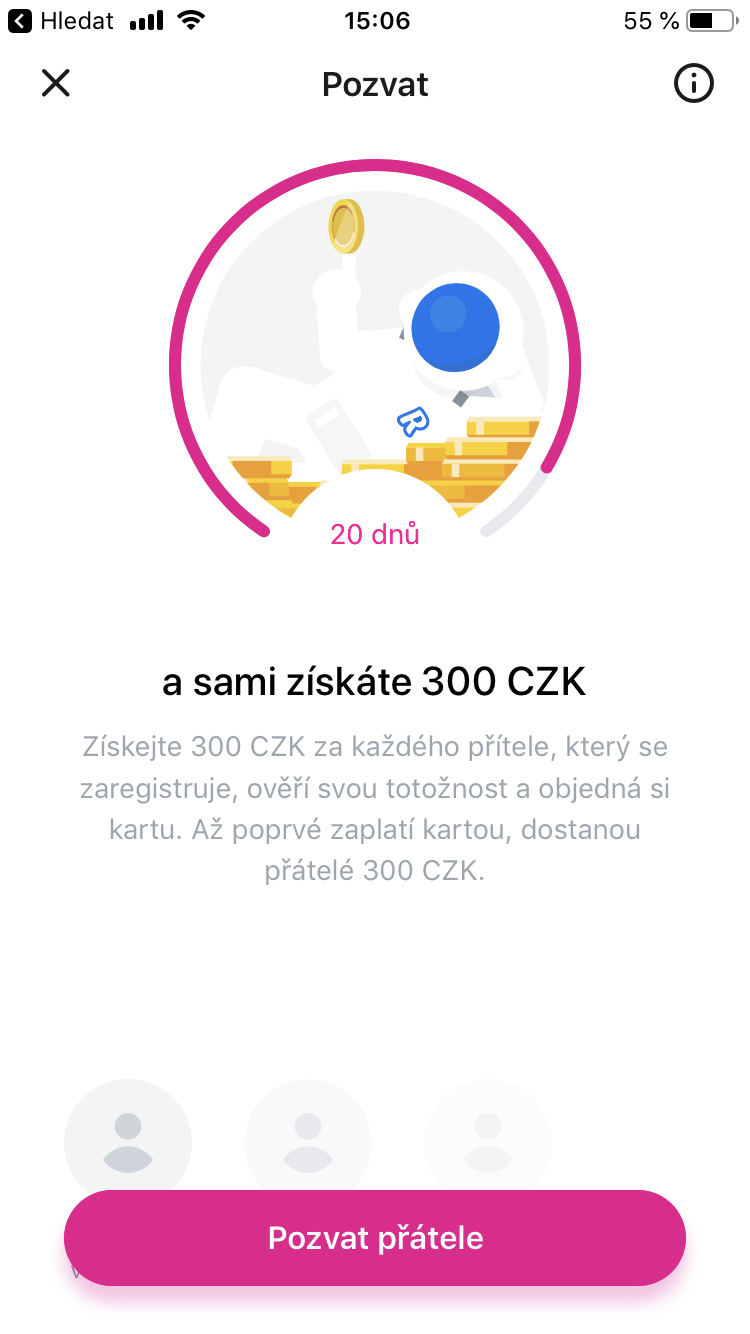Aplikaci následně stačí stáhnout, dokončit registraci a karta vám přijde za pár dní až do schránky 🙂 Stačí s ní zaplatit a 300 Kč je vašich – bez žádných poplatků! Hned poté můžete sami pozvat své přátele a začít vydělávat spolu 🙂